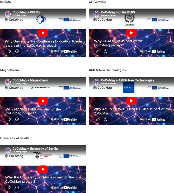 In these short videos, project partners present their role within CoCoMag, explain the relevance of their work, and give an overview of the scientific approaches and tools developed in the project. The aim is to make complex research topics more accessible, while highlighting the people and collaboration behind the development of innovative magnetic materials.